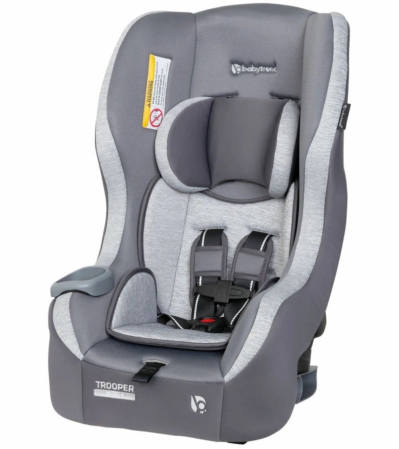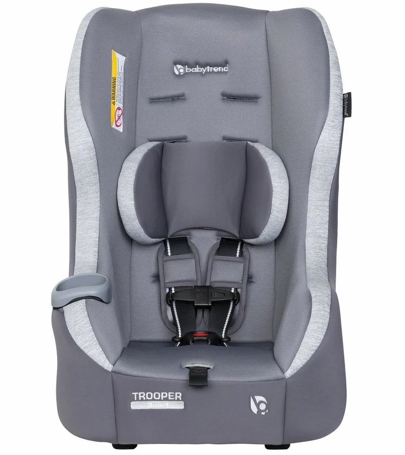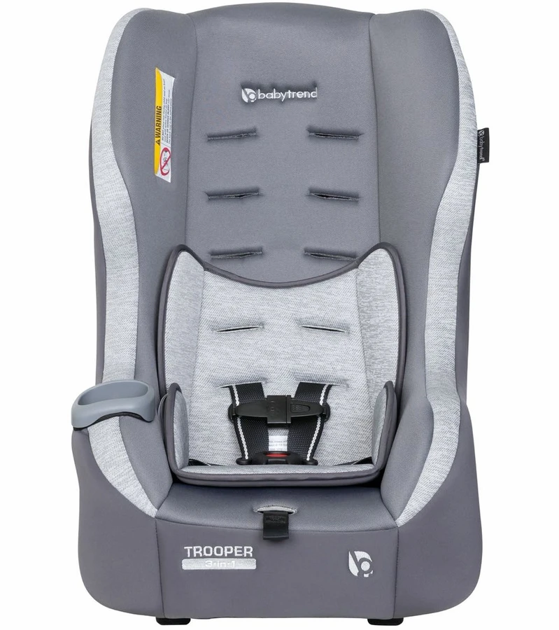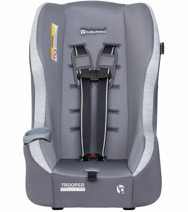 The Baby Trend Trooper 3-in-1 Convertible Car Seat converts from rear-facing infant seat (4-18lbs) and rear-facing toddler seat (18-40lbs) to forward-facing toddler seat (22-65lbs) as your child grows. With 5-position shoulder height adjustment and 3- position crotch buckle for seat adjustment, the Trooper convertible gives parents the ultra-convenience for installation and adjustment. The rear-facing recline flip foot also allows the Trooper to get great installation angles with ease. Trooper’s nimble frame can fit three across in most vehicles which is great for families that have more than one kiddo. The lightweight shell also allows for use of LATCH installation up to 55 lbs. The super-deep side wings offer better side impact protection and premium cushion, giving your babies great head protection and support. With premium fabric and the convenient integrated cup holder on the side, our Baby Trend Trooper 3-in-1 Convertible Car Seat truly gives your children the most comfortable and convenient commute/travel experience.