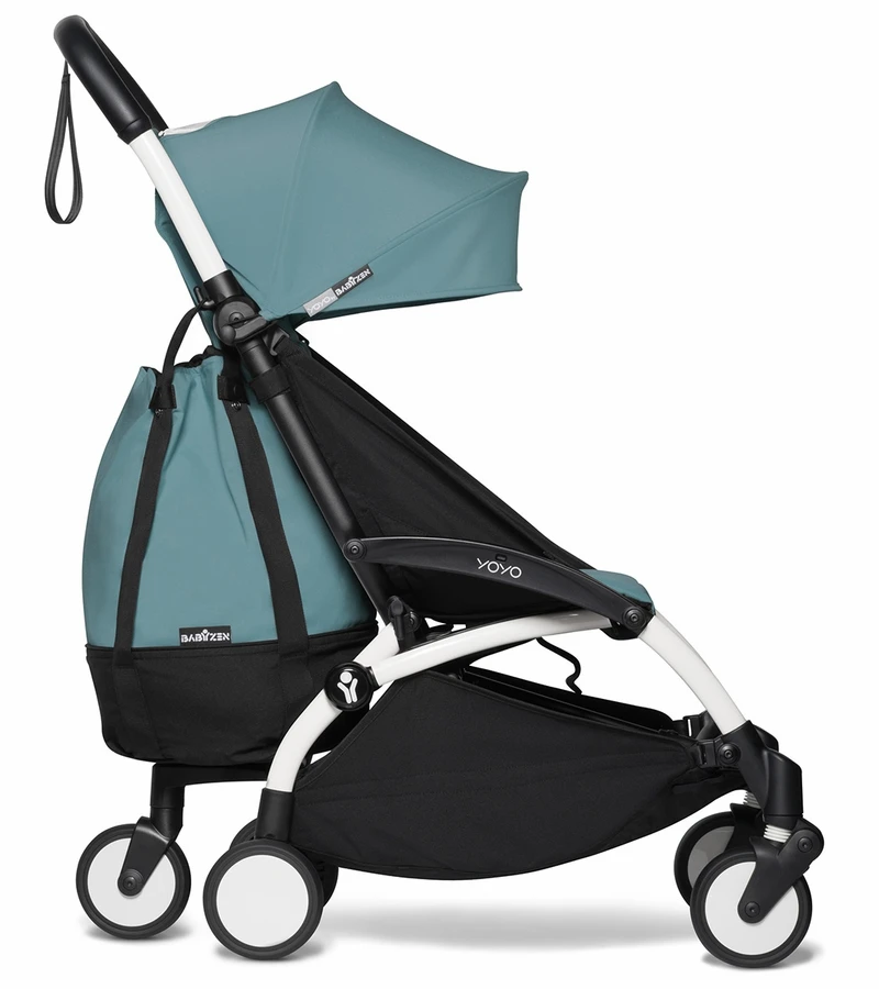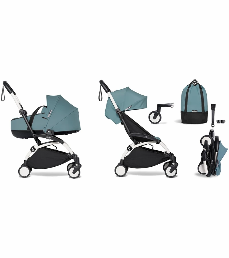 Babyzen YOYO2 Ultra Compact Complete 6+ Stroller With Bassinet & Rolling Bag Bundle – White/Aqua