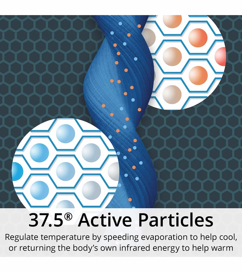 - Naturally derived volcanic mineral particles embedded in the fabric speed evaporation to help cool or return the body’s infrared energy to help warm