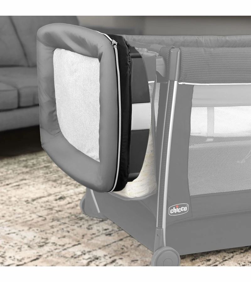 The Lullaby® Glow also includes wheels for easier maneuvering from room to room. A push-button fold and large carry bag simplify travel and storage for all components. A sleek design with premium fabrics and finishings pair tastefully with home furnishings and décor.
