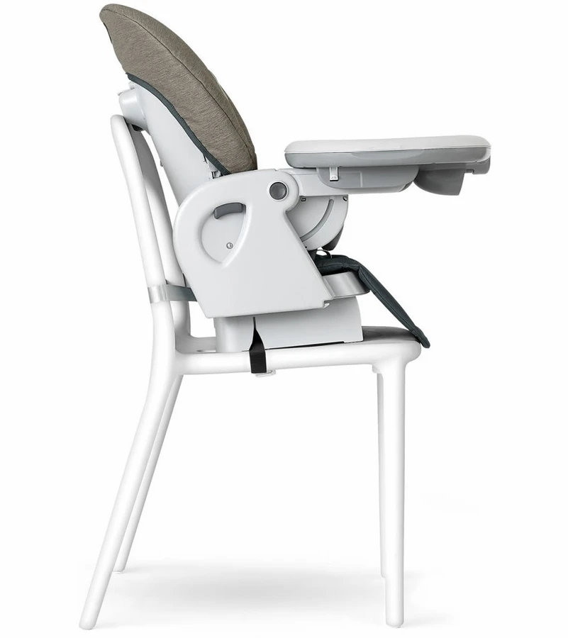 For growing babies, Progress™ offers all the convenience of an everyday highchair with a wipeable seat pad, five-point harness, removable tray, eight height positions, and four recline positions. As baby grows into a toddler, the highchair seat is easy to detach from its frame to create a high-back booster that secures easily to a dining chair for meals with the tray or at the table. A unique zip-off extension panel and foldable armrests convert the high-back booster to an even more streamlined, portable seat for big kids. For older children, the highchair frame can be used as a height-adjustable stool with a snap-on seat and fold-away footrest.