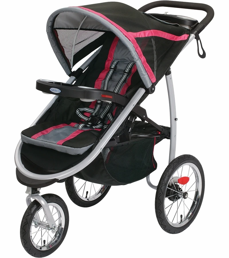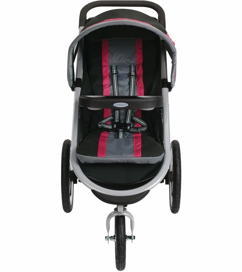 Graco’s jogger is the ultimate crossover stroller, combining all the comfort & convenience features of a traditional stroller with the performance & maneuverability of an all-terrain jogger. Air-filled, rubber tires provide a smooth ride for baby and a lockable front swivel wheel offers parents an easy transition from strolling to jogging. Locking the front wheel provides added stability while jogging while unlocking the swivel wheel allows for extra maneuverability on daily strolls. In addition, this jogger features the one-second FastAction fold for easy storage and transport perfect for parents on-the-go!