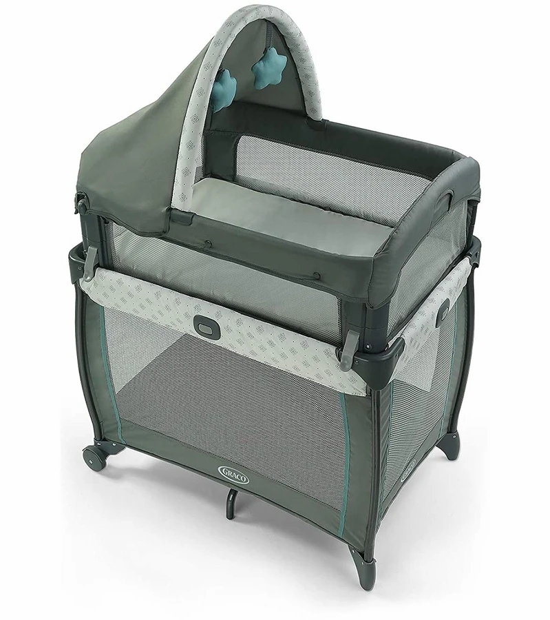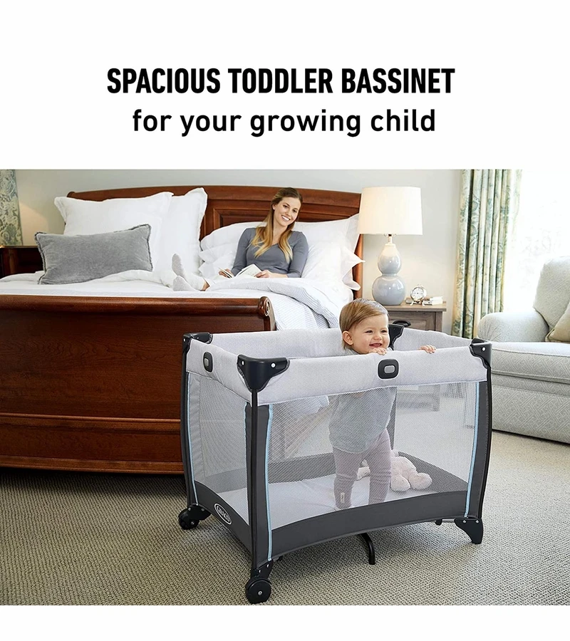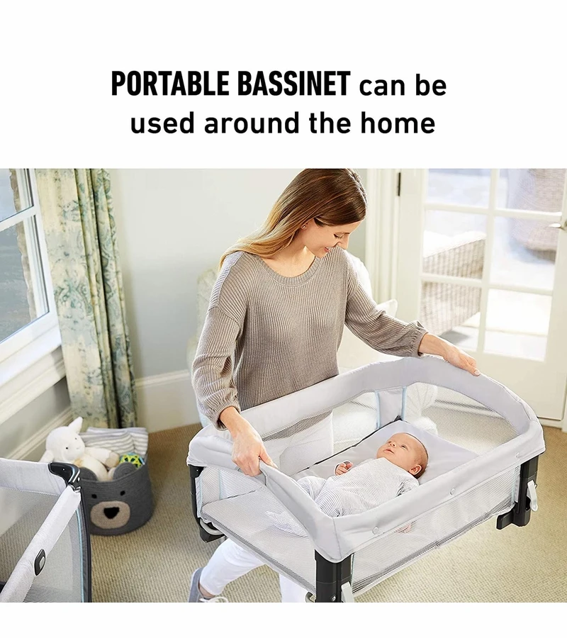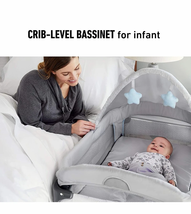 The Graco®My View™ 4-in-1 Bedside Bassinet offers four different ways to use, plus grows with baby and folds for travel! For newborns, the raised bedside bassinet perfectly positions baby at eye level. For infants, the bassinet lowers to crib-level and is removable for use anywhere! Finally, the bassinet is able to provide even more space for a growing toddler.My View™ also features a canopy to shield baby from light, keeping them cool and comfortable. Integrated wheels let you move the bassinet around your home, and the compact fold and included carry bag make travel easy. Whether at home or away, the Graco®My View™ 4-in-1 Bassinet ensures mom always has the perfect view for better sleep.