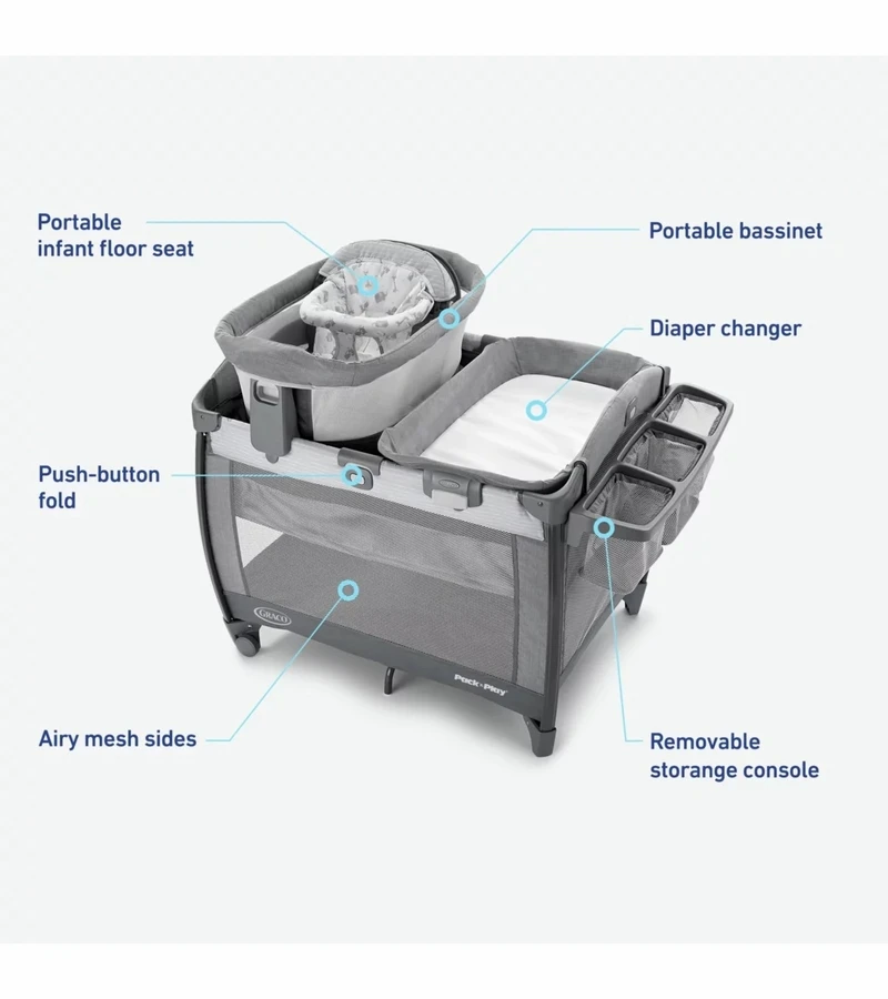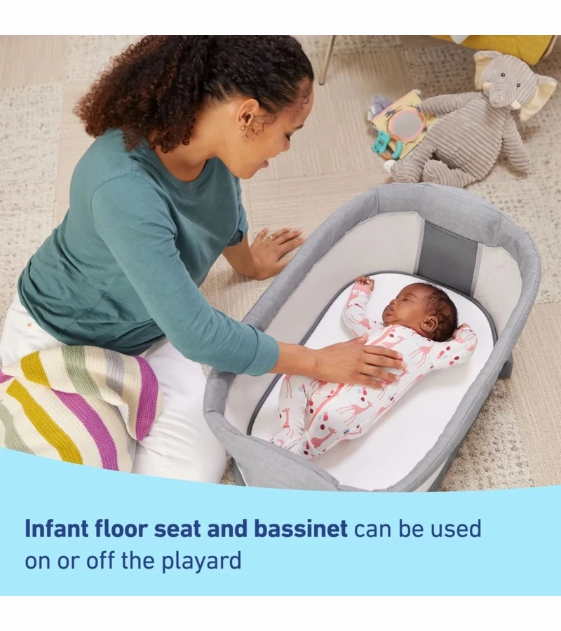 - Portable bassinet converts to an infant floor seat and can be used both on or off the playard