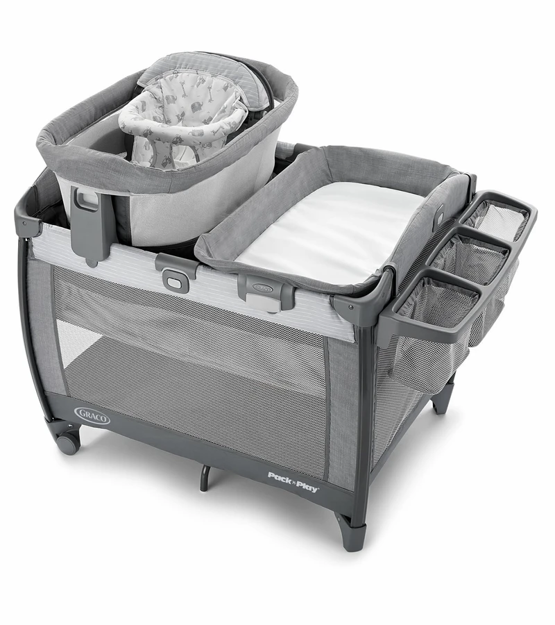 The Graco® Pack ‘n Play® Sit ‘N Growâ„¢ Playard is everything you need in a playard and more. This fully-featured, innovative playard combination includes a portable infant bassinet that converts to an infant floor seat, providing support as baby learns to sit independently. Both the bassinet and the floor seat topper can be used on top of the playard or can be taken off for use around the home. As your baby grows, the spacious playard provides more room to sleep or play. This playard includes a removable diaper changer with wipe-clean fabrics and a removable storage console with 3 pockets for storing baby’s essentials. Airy mesh sides allow airflow for baby’s comfort and provide visibility for parents. An easy push-button fold and the included carry bag make it simple to pack up for travel or storage.
