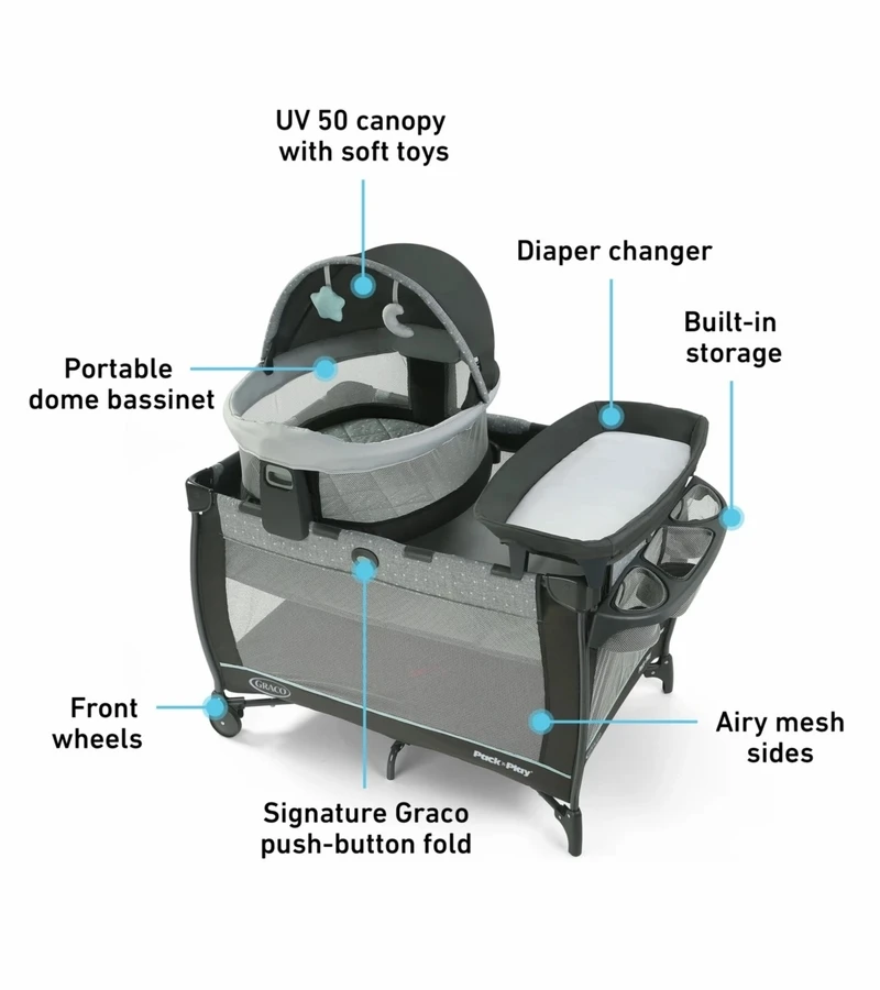 The Graco Pack ‘n Play® Travel Domeâ„¢ LX Playard features a portable Travel Dome LX bassinet that can be used in or out of the home, so that you can keep baby by your side anywhere. The removable bassinet features a UV 50 canopy and carry bag, for comfort and convenience when you enjoy the backyard with baby or head to a park play date. When used on the playard, the bassinet can be positioned at eye level for easy check-ins throughout the night. This playard includes a removable quilted diaper changer with wipe-clean fabrics and an integrated storage area for baby’s essentials. The Graco playpen transitions with baby and can convert into a toddler playard with wheels for easy mobility around the home. Graco’s signature push-button fold makes it easy to fold up for storage. With Graco’s Travel Dome LX Playard, baby is ready to go wherever you go!