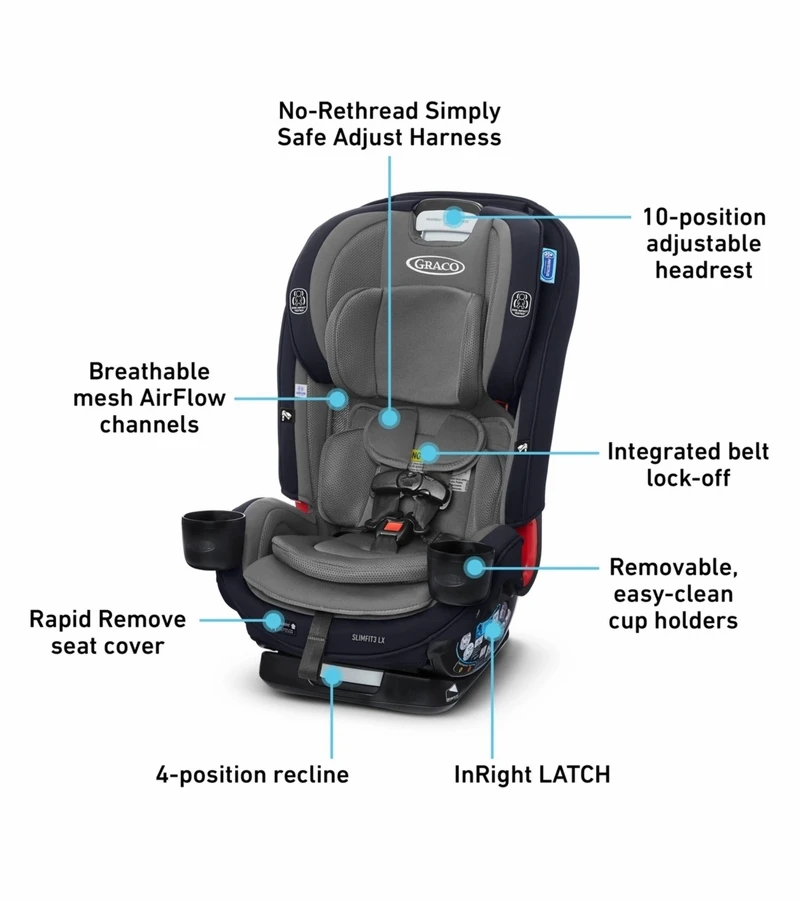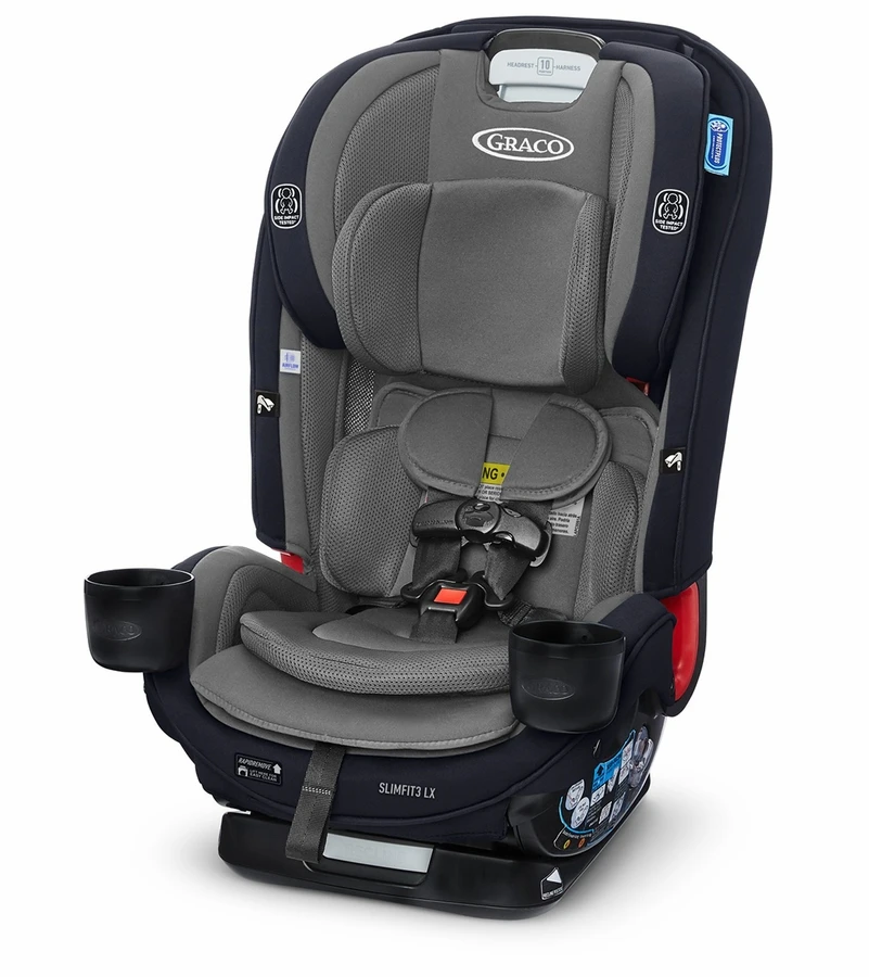 The Graco® SlimFit3™ LX 3-in-1 Car Seat is our slimmest design that fits 3 car seats across, saving space in your back seat without compromising on the safety you trust and the features you need. This narrow all-in-one car seat grows with your child from rear-facing harness (5-40 lb) to forward-facing harness (22-65 lb) to highback booster (40-100 lb). We tested our lightweight 3-across car seat in every configuration, to help ensure your growing family can fit in your vehicle, even with children of different ages who ride in different modes, or when paired with select other Graco car seats. Integrated belt lock-off makes for easy vehicle seat belt installation in forward-facing mode, and allows you to position your seats to maximize space with 3 across. Graco’s exclusive push-button InRight™ LATCH provides an easy, one-second attachment with an audible click to help ensure secure installation. We made thoughtful design choices to make the SlimFit3 easy to adjust with 3 car seats in the back seat. The No-Rethread Simply Safe Adjust™ Harness System allows you to adjust the height of the headrest and harness to 10 positions with just one motion for just the right fit. Easily adjust the 4-position recline for a better installation and a comfortable ride. The Rapid Remove cover comes off in 60 seconds, without uninstalling the seat or removing the harness, and is machine washable. Plus, the SlimFit3™ is slim enough to fit 3 across, but spacious enough to keep your growing child comfy. Breathable mesh AirFlow channels provide improved ventilation to keep your child cool and comfortable. Two cup holders are designed to work with the three-across configuration to keep drinks and snacks close at hand. Fuss-free harness storage pockets conveniently hold the harness out of the way while your child gets in and out. Removable, plush head and body inserts help to keep your infant feeling cradled and comfortable. The steel-reinforced frame provides strength and durability for years of use, and EPS energy-absorbing foam provides effective impact energy management. This car seat is Graco® ProtectPlus Engineered™ to help protect in frontal, side, rear, and rollover crashes.