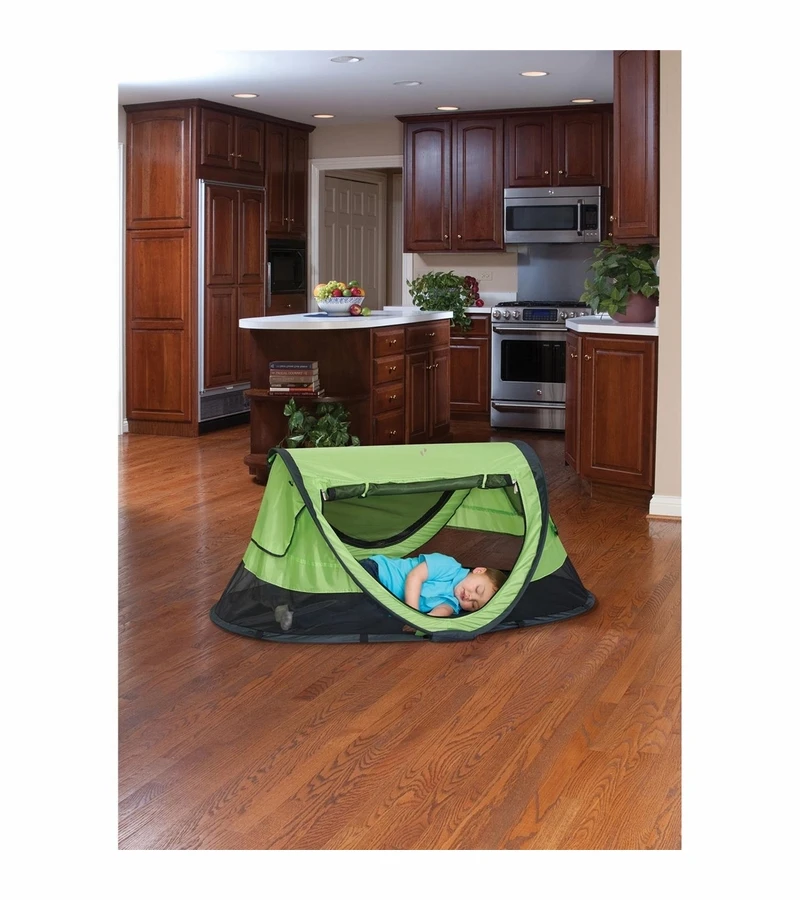 This convenient travel bed offers peace of mind to parents trekking with kids. A lightweight mesh surround provides increased air flow while a large front zipper panel makes access to your child effortless. The Micro-Lite sleeping pad comes firmly secured to the outer bottom of the PeaPod Plus with snaps, but is easily removable for cleaning or packing. The PeaPod Plus also has great features for outdoor use including UV protection, anchor straps, adjustable sun screens, and an inner mesh zipper panel perfect for keeping insects out! This handy bed also quickly folds for storage inside its own bag and fits into your luggage, making it perfect for short visits or long trips.