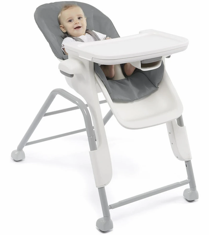 - Tray rests flat on table to prevent bowls and cups from tipping when removing baby from chair