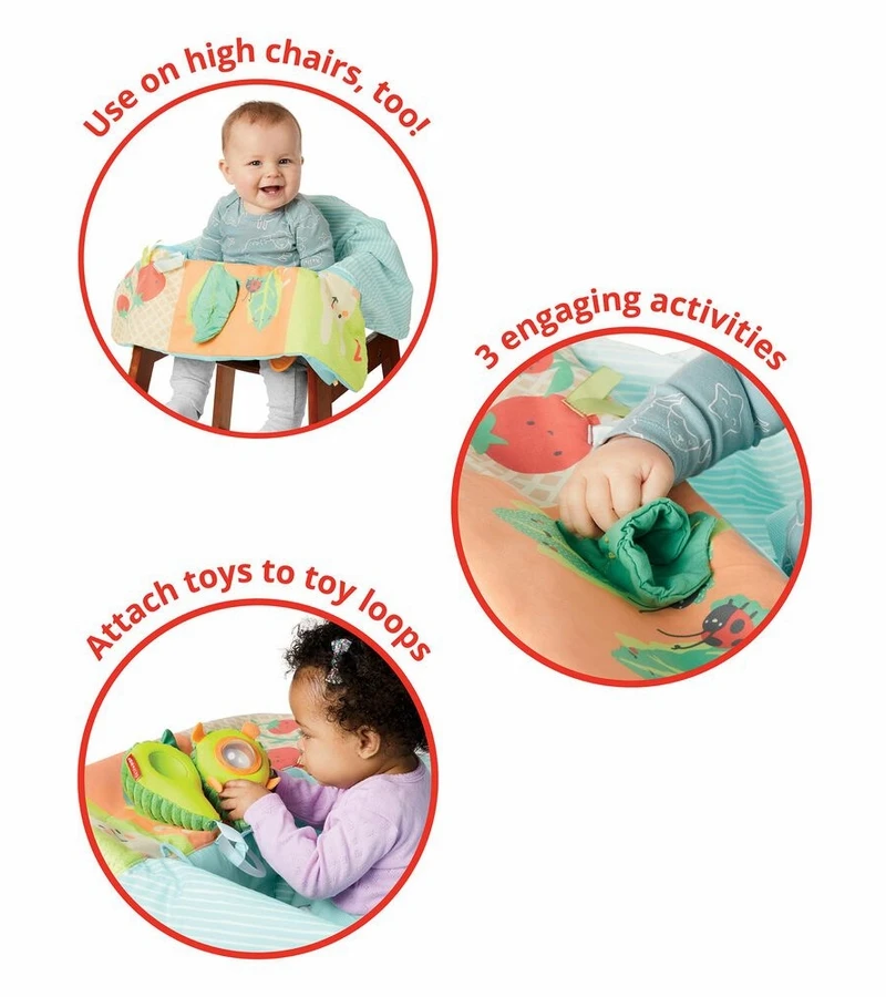 Shopping for fresh produce at the grocery store with your little one? Keep ‘em entertained and away from dirty surfaces with our farm-fresh shopping cart cover. Also great for restaurant-style high chairs, our machine washable liner has soft cushioning and padded leg openings. Even better? Fun activities include a carrot teether toy, crinkle leaves, toy loops & more to engage baby as you shop or dine.