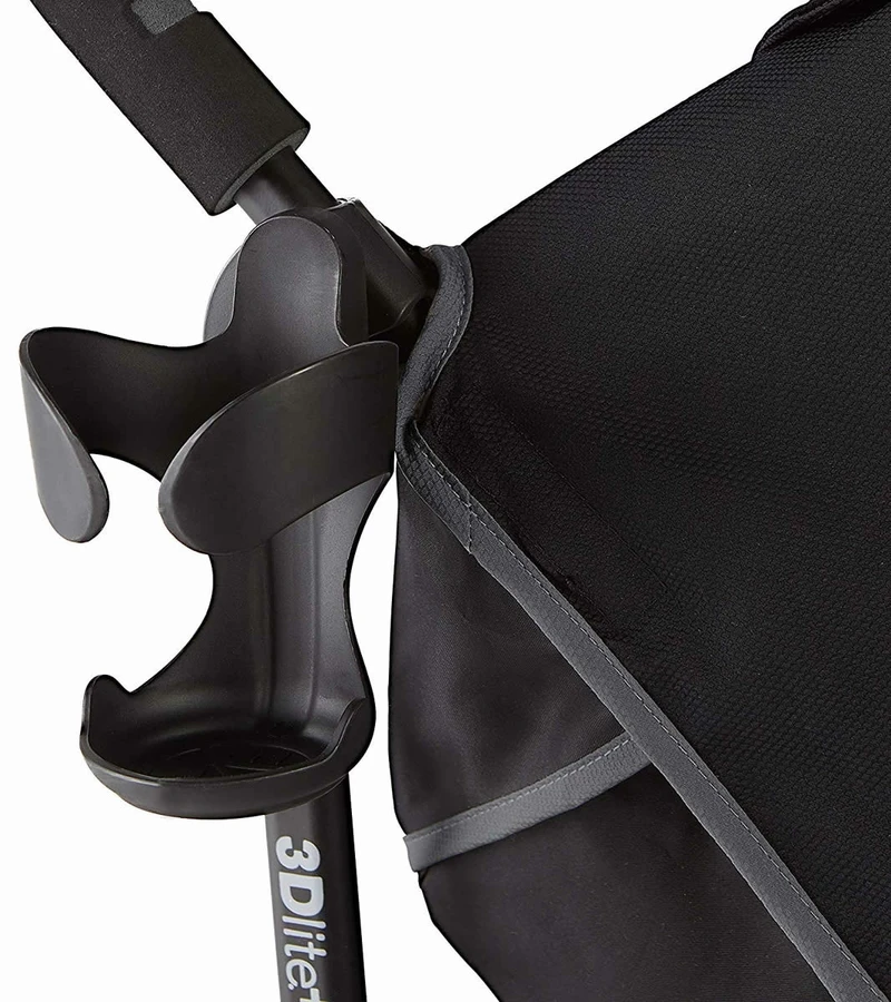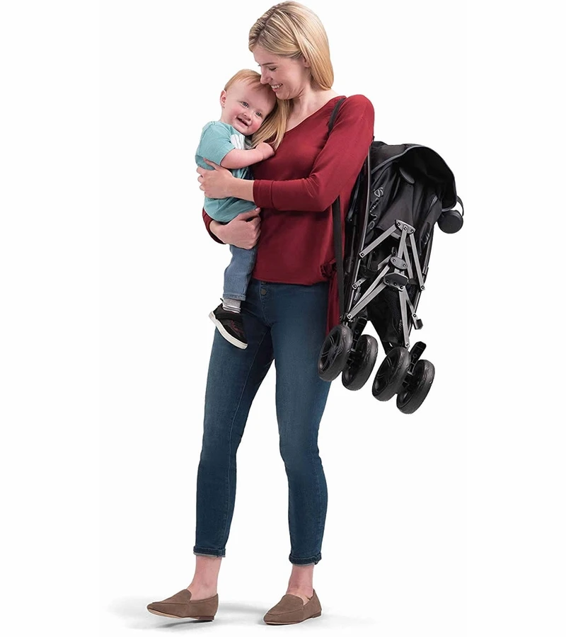 - Additional features: parent cup holder, cell phone holder, zip-close storage pocket, child sippy cup holder, compact fold with auto-lock and carry strap, anti-shock front wheels and lockable rear wheels