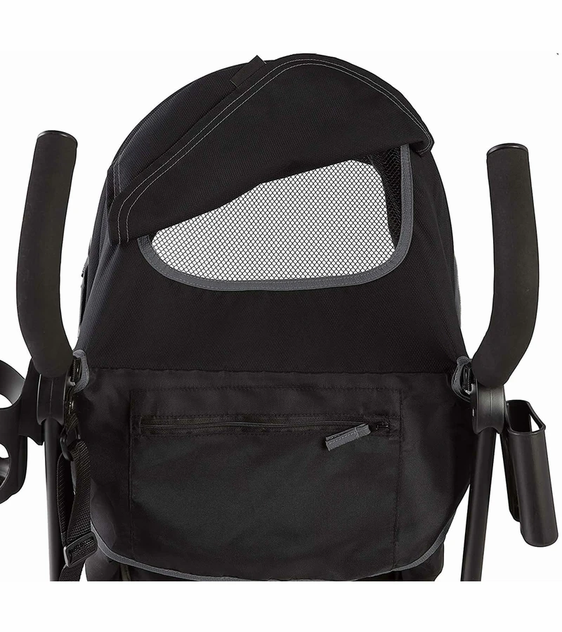 - Oversized canopy with flip-out sun visor and peek-a-boo window